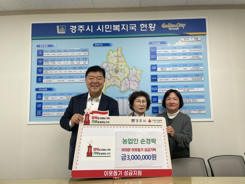 경주시 현곡면에 거주하는 농업인 손경락 씨가 지역의 어려운 이웃을 위해 성금 300만원을 기탁하며 따뜻한 나눔을 실천했다. 경주시는 3월 6일 시민복지국장실에서 성금 전달식을 갖고 손경락 씨로부터 어려운 이웃을 돕기 위한 성금을 전달받았다. 이날 전달된 성금은 경북사회복지공동모금회를 통해 지역 내 도움이 필요한 취약계층 지원에 사용될 예정이다. 손경락 씨는 지난 2025년 하반기에도 성금 200만원을 기탁하는 등 꾸준히 이웃사랑을 실천해 오고 있다. 손경락 씨는 “작은 정성이지만 지역의 어려운 이웃들에게 조금이나마 도움이 되길 바란다”며 “앞으로도 지역사회와 함께하는 나눔을 이어가겠다”고 말했다. 윤철용 시민복지국장은 “어려운 이웃을 위해 따뜻한 나눔을 실천해 주신 손경락 씨께 감사드린다”며 “기탁해 주신 성금은 도움이 필요한 이웃들에게 소중히 전달하겠다”고 전했다.